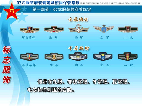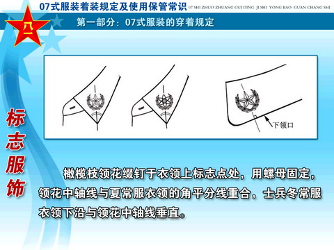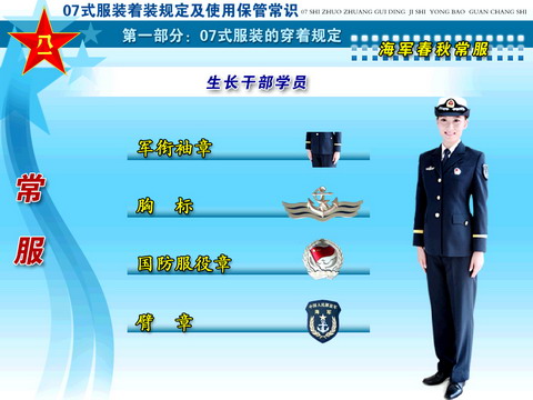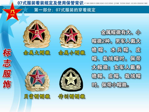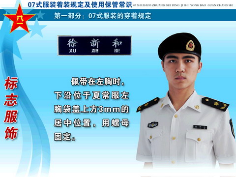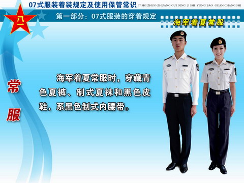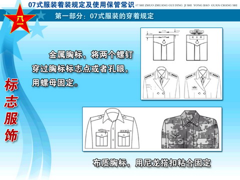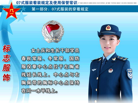 ??? 经党中央、中央军委和胡主席批准,全军部队从2007年8月1日起,陆续换发07式军服。这次军服调整改革,是贯彻落实科学发展观、推进军队革命化、现代化、正规化建设的重大举措,是党中央、中央军委和胡主席对全军官兵的关心厚爱,对于振奋军心,鼓舞士气,增强部队凝聚力、战斗力,进一步树立我军威武之师、文明之师的良好形象,具有十分重要的作用。