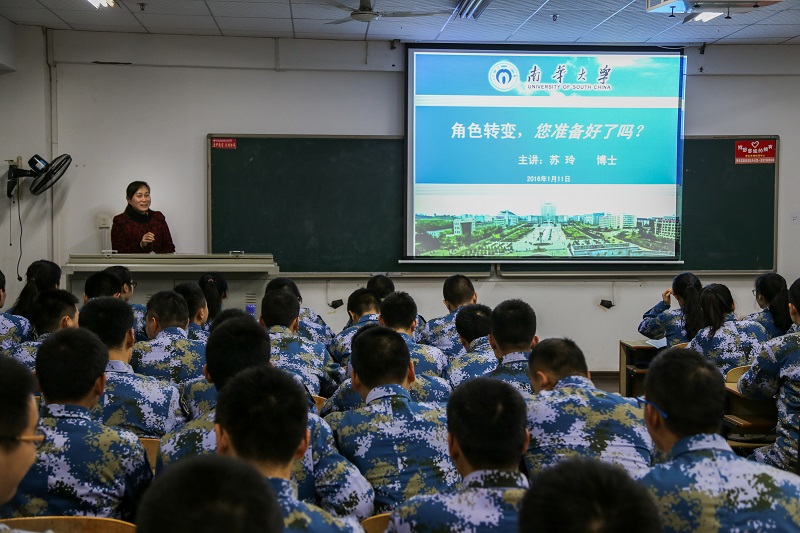 2016年1月11日晚,国防生大队在1-308进行冬训第7课,角色转换专题讲座,校党政办主任苏玲博士应邀授课,选培办全体人员出席并与大队同志一起听取授课。