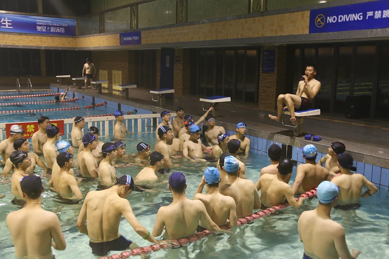 考虑到海军航空工程学院游泳专业优势,选培办还邀请胡主任利用晚上时间为学员们上了一堂内容丰富的游泳训练课,课上规范了国防生们的蛙泳动作,提示了注意事项,对游泳过程中的姿势不协调、不会换气等问题提出了科学有效的训练方法,收到良好效果。